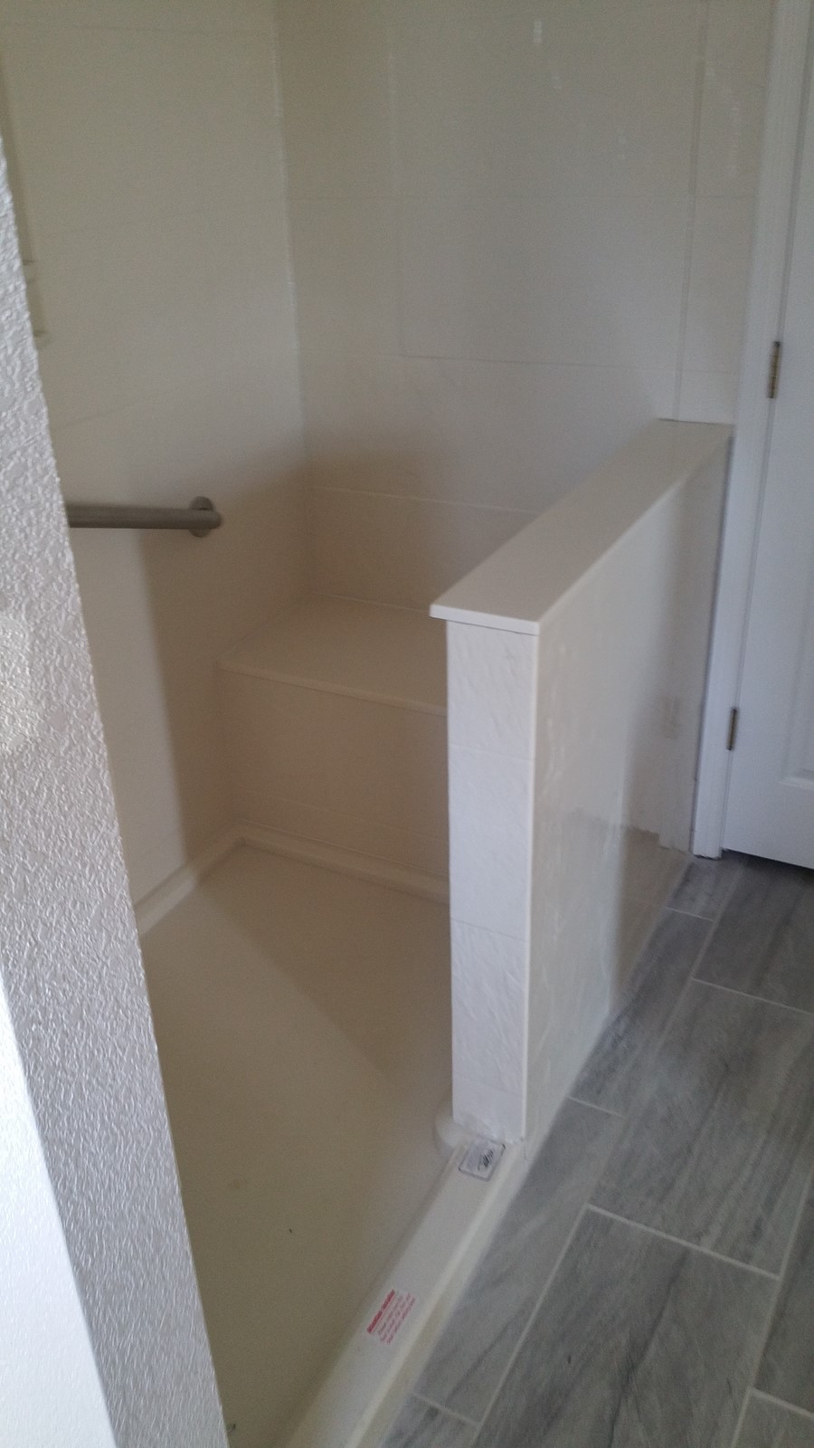 Onyx shower with seat and grab bar. Custom shower pan with low threshold.