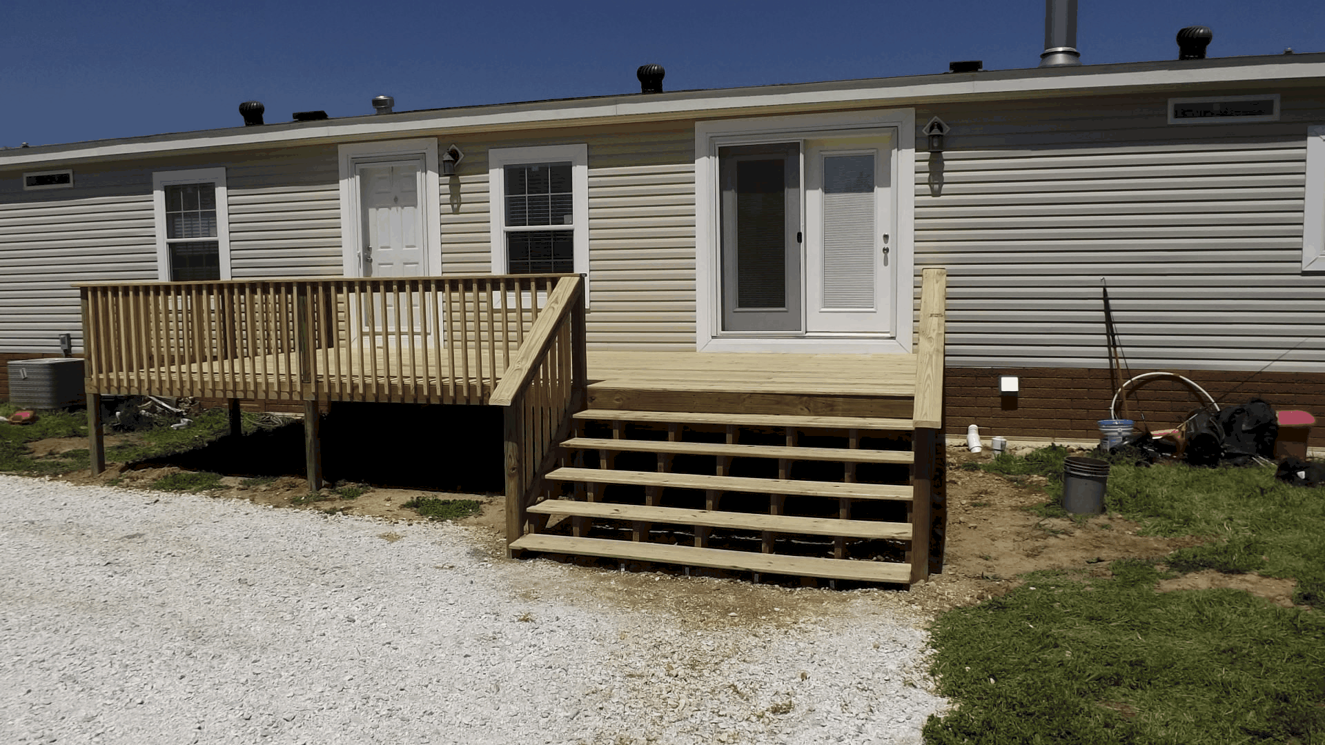 This deck was built free standing from the house. This house in Springdale, Arkansas is a moduler home and has no way to attach to the house. The deck turned out great and the customer was very happy with the project.